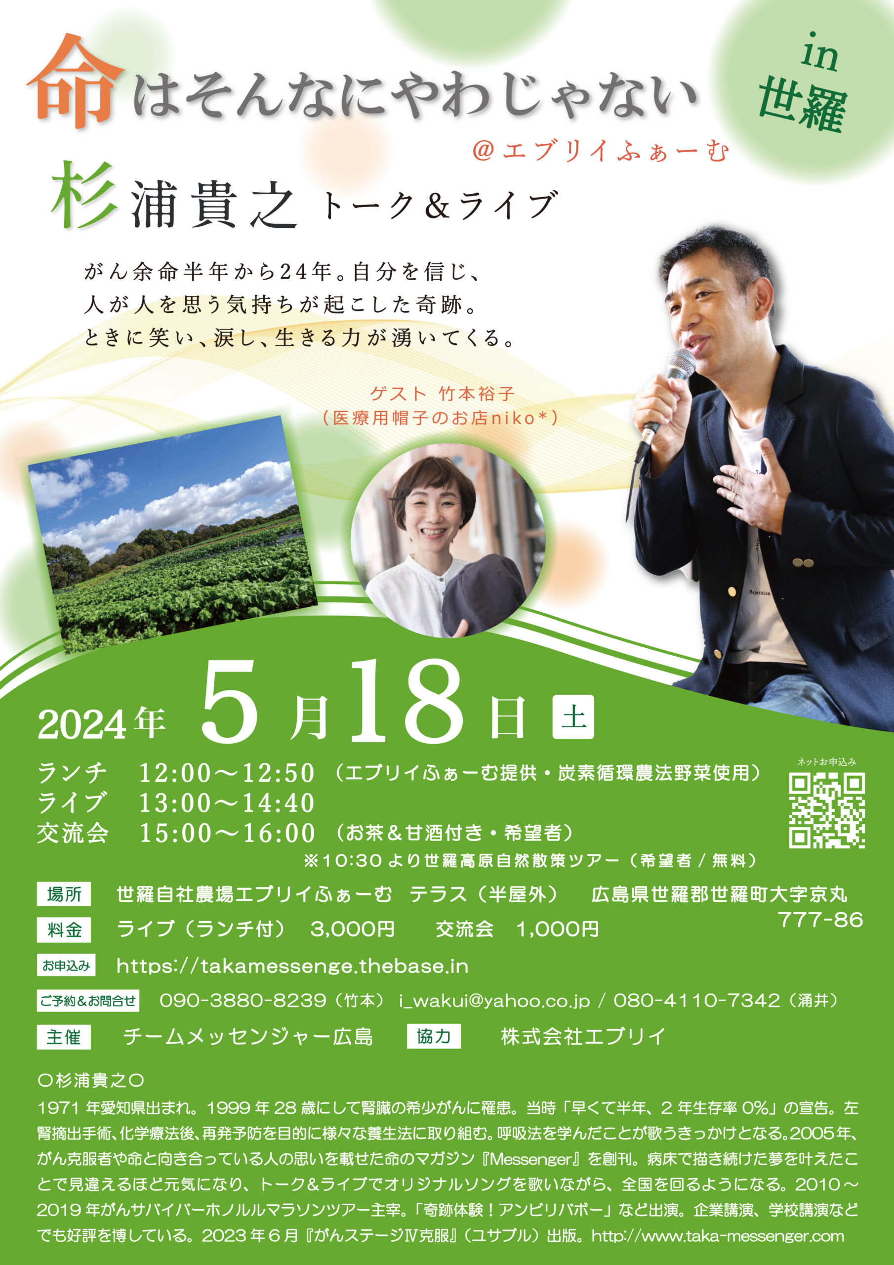 日記5月18日(土)杉浦貴之トーク&ライブ in 世羅(広島県) @エブリイふぁーむ
