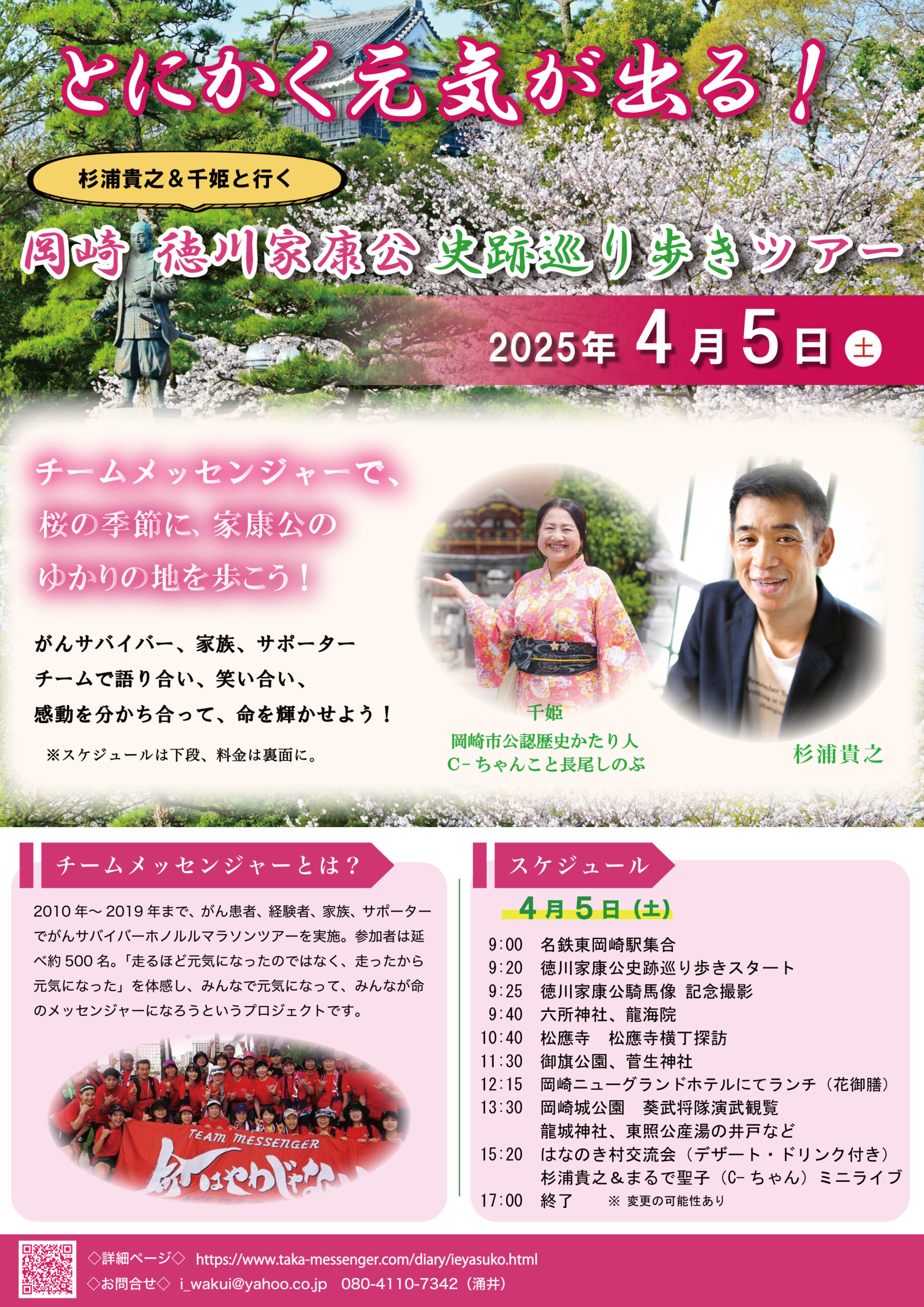 日記チームメッセンジャー企画!4月5日(土)『とにかく元気が出る!杉浦貴之&千姫と行く、がんサバイバー・岡崎 徳川家康公史跡巡り歩きツアー』