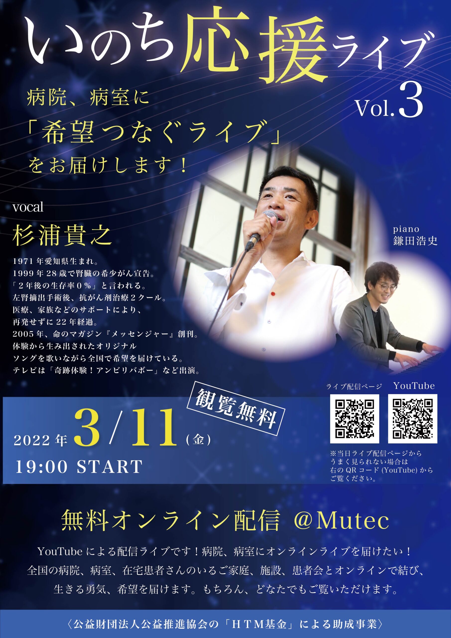 日記【病院、病室にオンラインライブを届けたい!音楽で希望を、生きる力を!】3月11日(金)「いのち応援ライブ Vol.3」を開催!