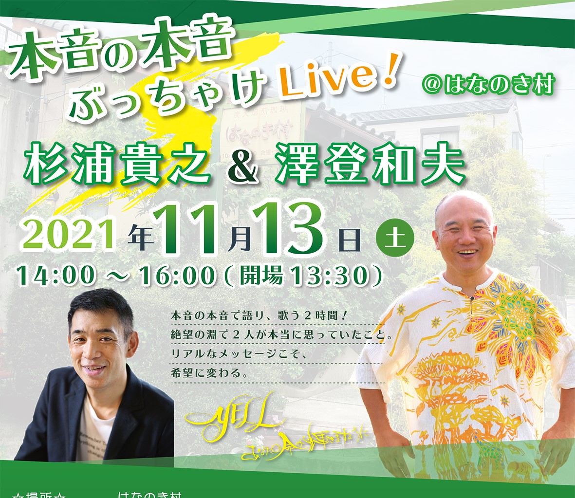日記リアル&ZOOM配信!11月13日(土) 杉浦貴之&澤登和夫 本音の本音ぶっちゃけLive! @はなのき村
