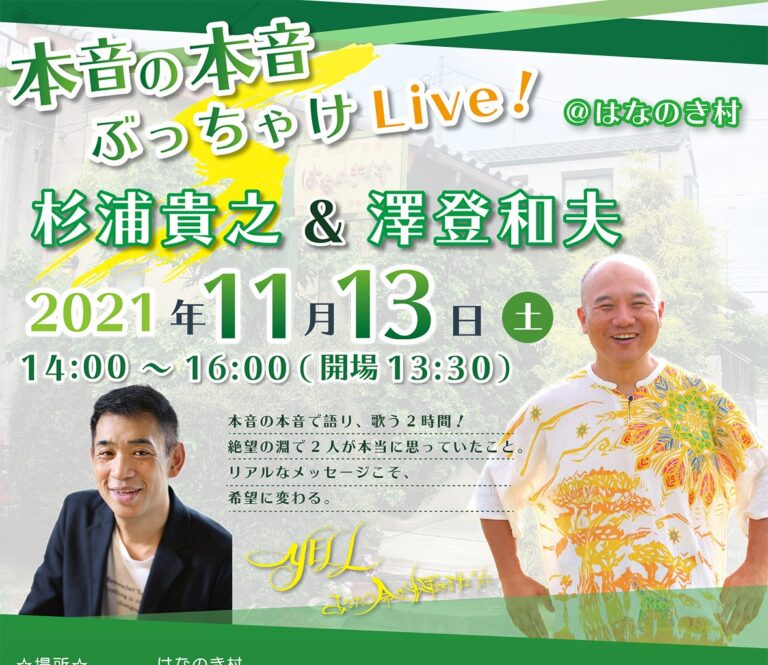 リアル&ZOOM配信!11月13日(土) 杉浦貴之&澤登和夫 本音の本音ぶっちゃけLive! @はなのき村