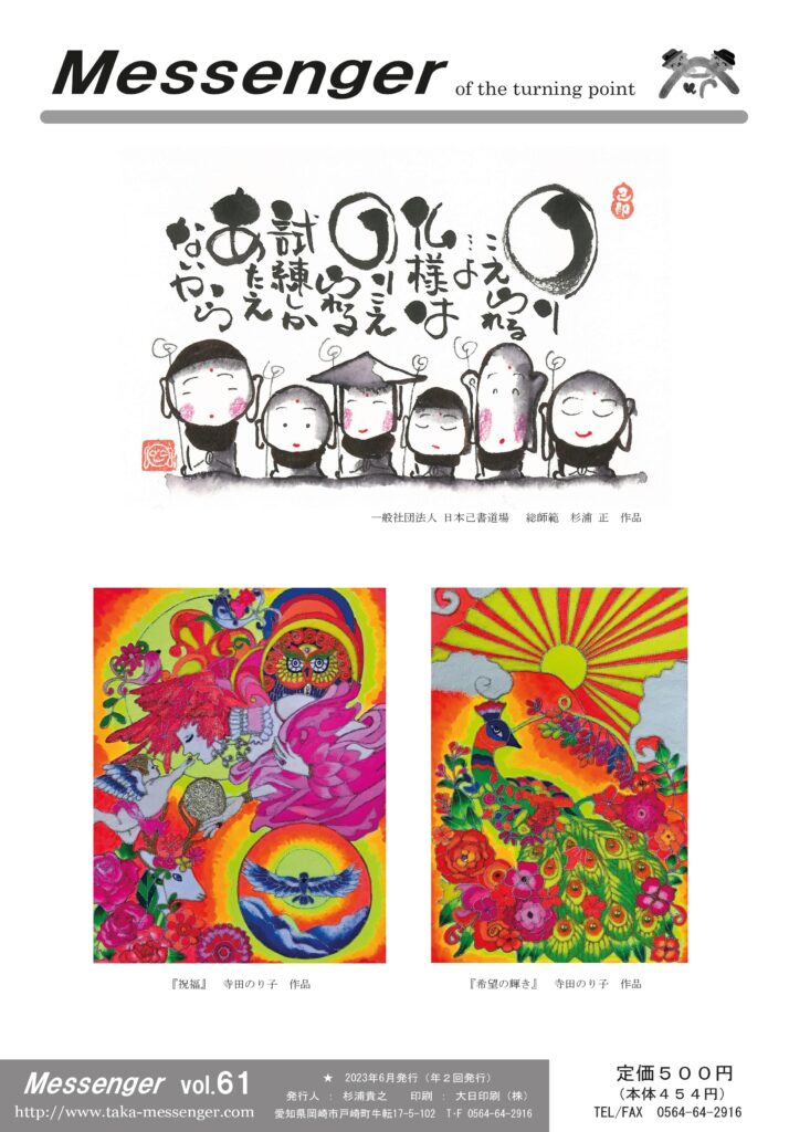 ☆ 「表紙裏の書」は一般社団法人 日本己書道場総師範・杉浦正さんの作品。☆絵(塩絵)は寺田のり子さんの作品。
