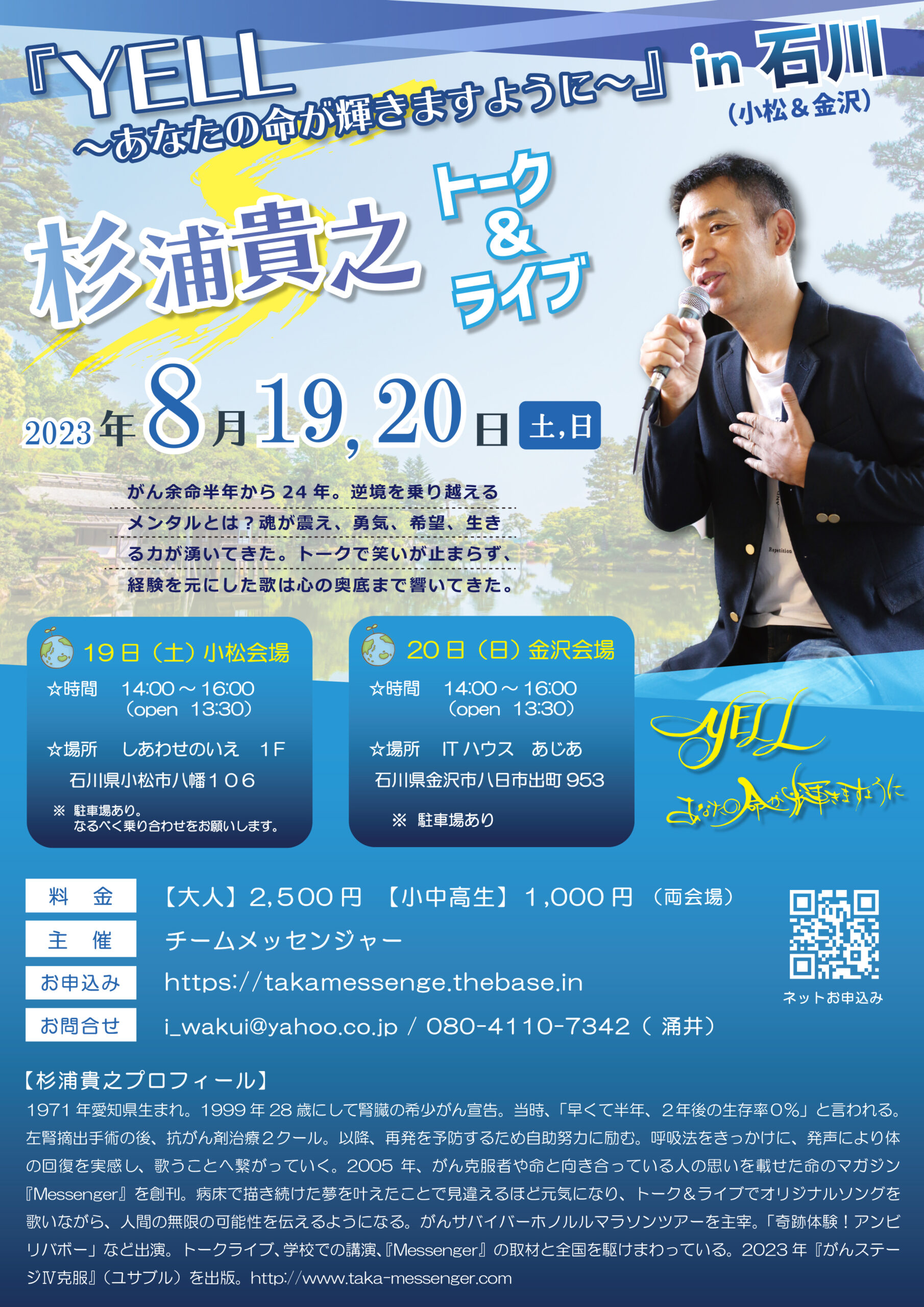 日記8月19,20日(土,日)杉浦貴之トーク&ライブ in 石川(小松市&金沢市)