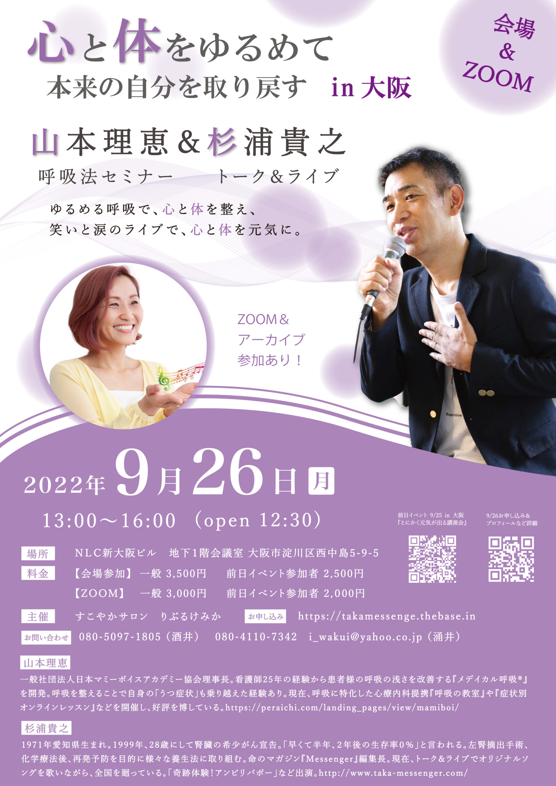 【会場&ZOOM&アーカイブ】9月26日(月)山本理恵&杉浦貴之 セミナー&ライブ in 大阪