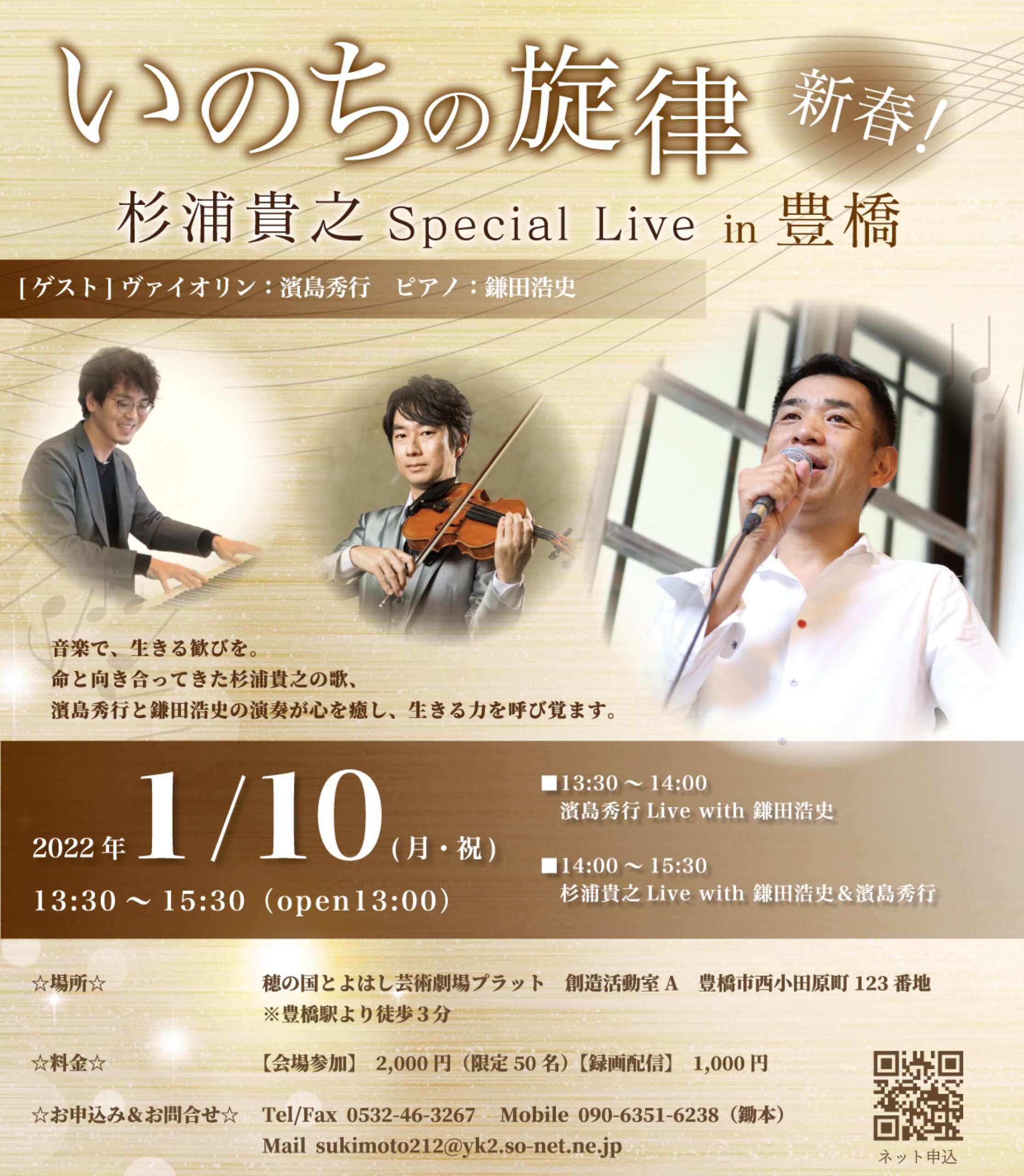 会場&録画配信!2022年1月10日(月・祝)『いのちの旋律』杉浦貴之 Special Live in 豊橋 ゲスト ヴァイオリン:濱島秀行 ピアノ:鎌田浩史