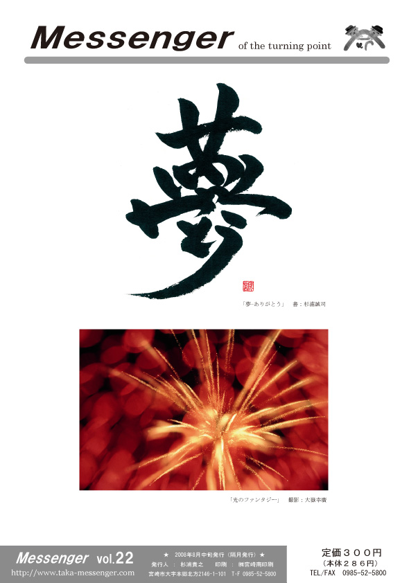 裏表紙の書は「めっせー字」の杉浦誠ちゃんの「夢?ありがとう」。写真は大嶽幸廣さん。